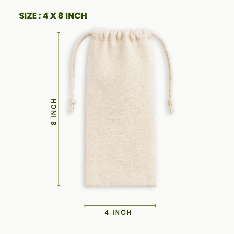 High quality cotton drawstring pouch 4×8 inch made using breathable natural cotton fabric. These eco friendly cotton pouches are perfect for jewellery storage, herbal infusions, beauty product packaging and sustainable brand packaging.