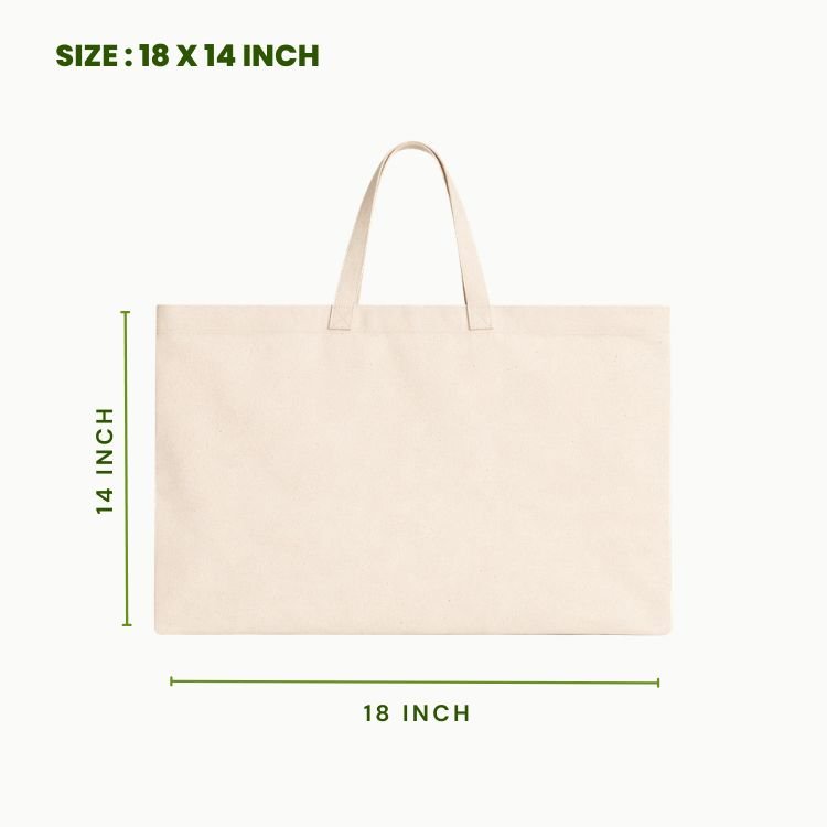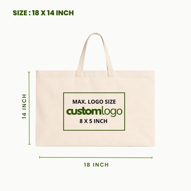 Premium custom canvas tote bag supplier bulk 18×14 inch manufactured using strong canvas fabric designed for large capacity shopping, promotional branding, retail packaging and reusable carry solutions. This wide canvas tote bag features reinforced stitching and a smooth surface suitable for custom logo printing.