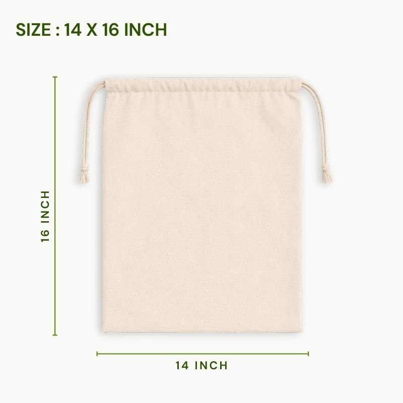 Premium extra large canvas cotton drawstring pouch 14×16 inch manufactured using durable canvas cotton fabric designed for sustainable packaging and reusable storage solutions. These canvas drawstring bags are widely used for jewellery packaging, skincare products, herbal ingredients and eco friendly brand packaging.