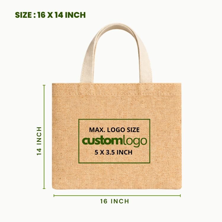 Practical and durable juco retail carry bag manufacturer 16×14 inch designed for retail packaging, promotional use and daily carry applications. The balanced structure offers sufficient width and height for versatile product storage along with effective branding space.