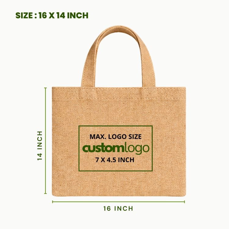 Premium promotional jute tote bag supplier 16×14 inch crafted from natural jute fibers, ideal for brand campaigns, corporate giveaways and retail packaging solutions. This wide-format jute bag offers a strong structure with an optimized surface for clear promotional printing.